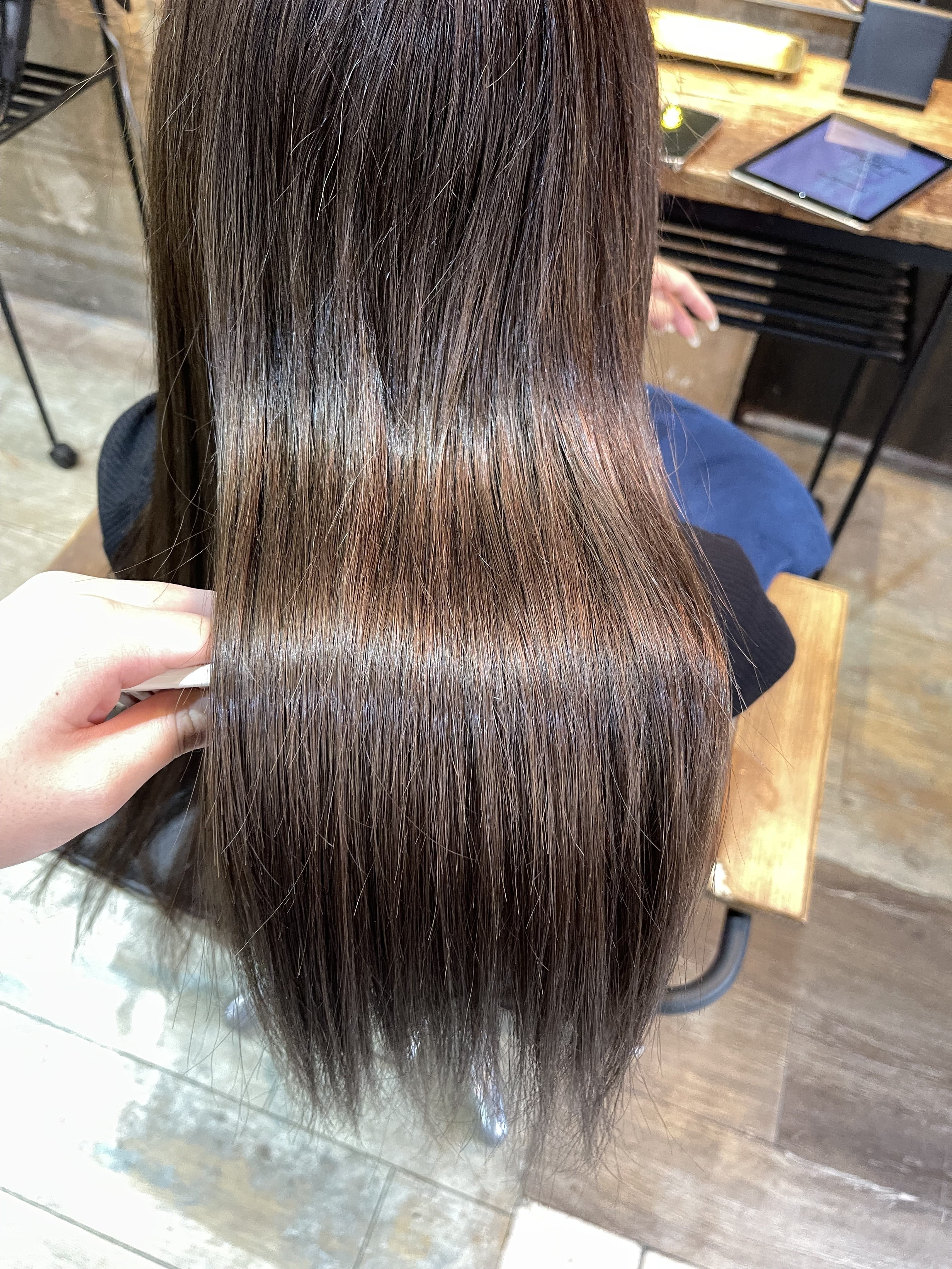 このお客様はまだ髪質改善真っ最中ですが、一回目と比べて髪の毛が柔らかくソフトな手触りになり、引っかかりもなくなってきています♪