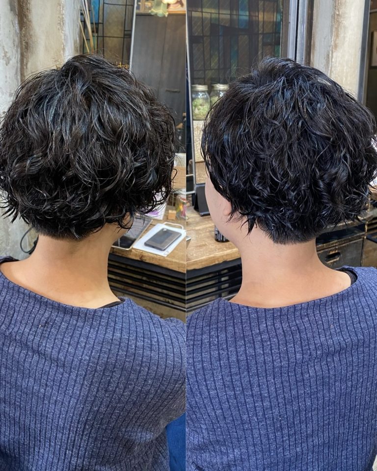 サイドと後ろは緩く刈り上げてボリュームを抑えたマッシュベースのスタイルに スパイラルパーマを