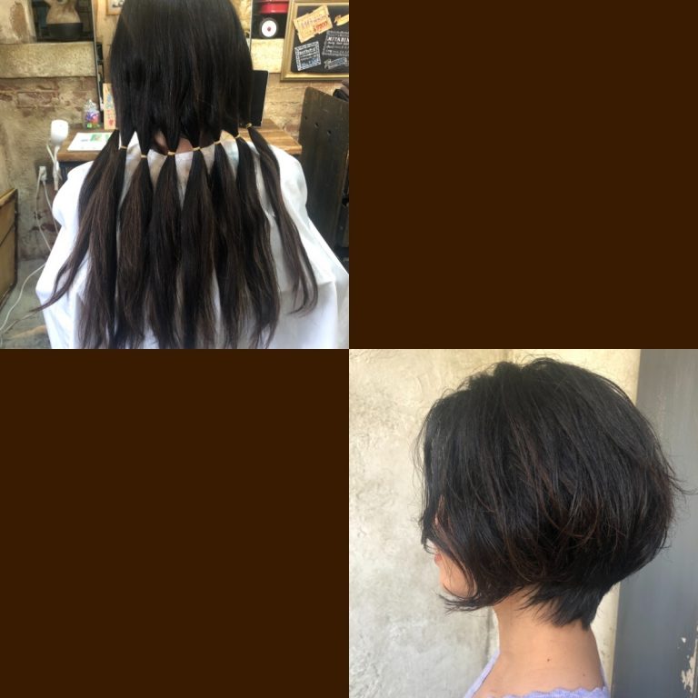 ヘアドネーションでは ばっさり切ることで 普段のスタイリングと ちがったり癖の出方が 人によって変わるので そこをしっかり合わせながら カットさせて頂いております
