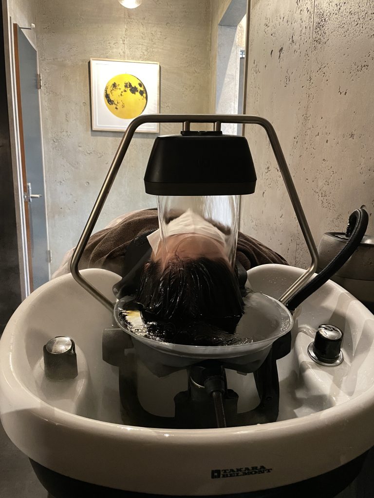 初めに炭酸のシャンプーでじっくりマッサージしていきます。 それからフェイスラインから温かいお湯をかけ流して頭全体を浸します♪